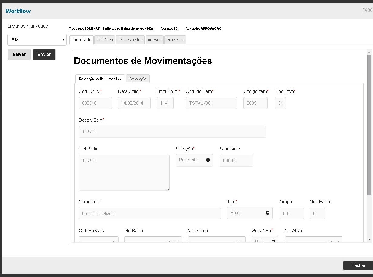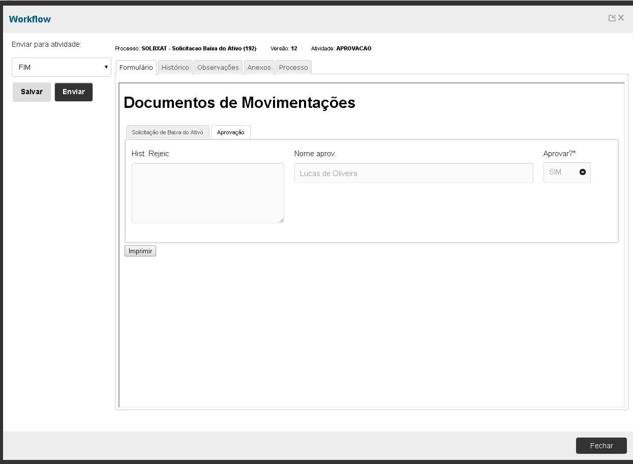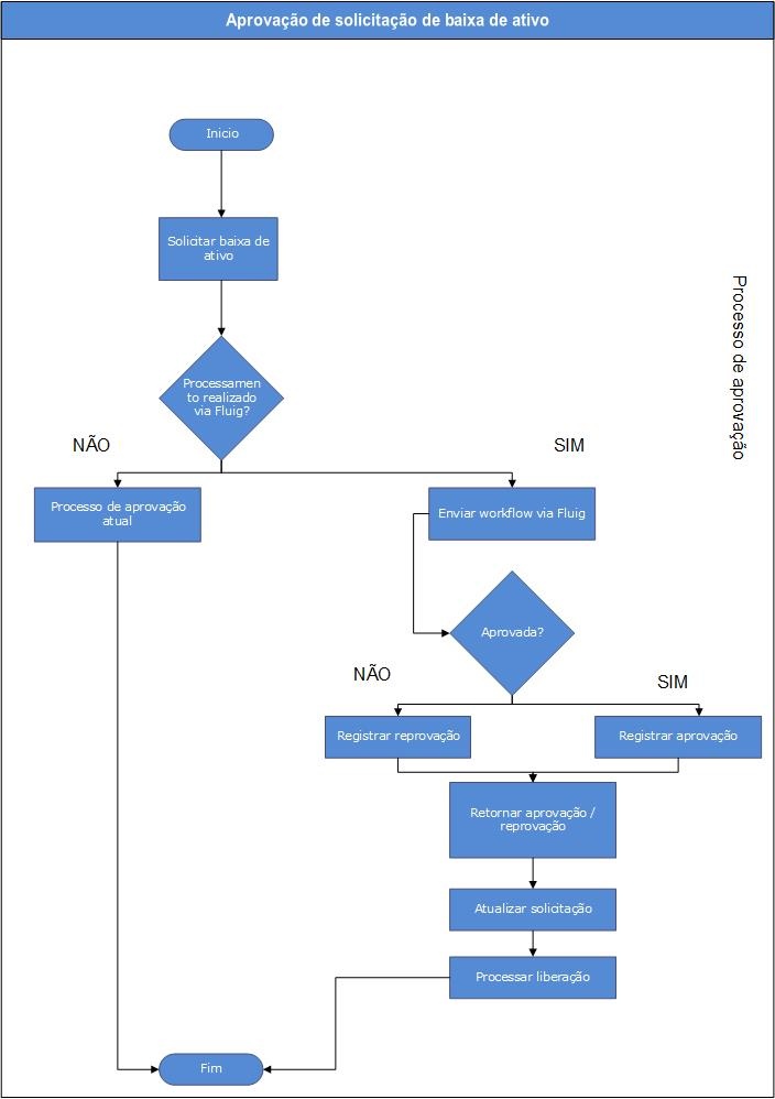 El procedimiento de Aprobación para solicitud de baja de activo tiene como propósito controlar las aprobaciones a partir de un workflow del Fluig, enviando una tarea de aprobación al responsable del bien después del registro de la solicitud de baja del activo.
