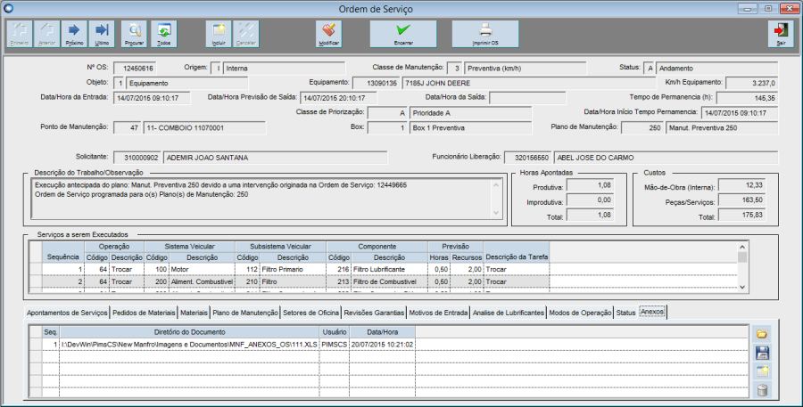 Para anexar um arquivo, clique no botão "Procurar" para localizar a OS desejada. Encontrando-a, clique na guia "Anexos".