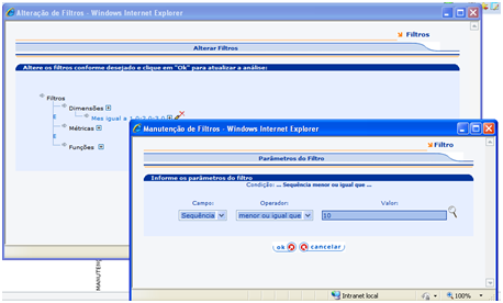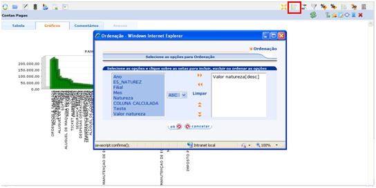 Passo a passo: | No exemplo em questão, tomou-se como base uma análise de despesas. Deve-se ordenar a análise por ordem decrescente no campo Valor natureza. Em seguida, deve-se incluir a numeração das linhas (ícone Incluir campo de Sequência). Após isso, deve-se gerar um gráfico qualquer ou o mais adequado na situação. Selecionar no Eixo X a dimensão e no Eixo Y a métrica. Colocar o título do gráfico e clicar em OK. Após gerar o gráfico selecionar o ícone Ordenação (8º ícone da direita para esquerda) e colocar a métrica para ser ordenada em ordem decrescente (Desc). Ir no filtro Funções do Gráfico e selecionar o campo Sequência e o operador desejado, informando o valor. O exemplo abaixo está configurado para trazer os 10 maiores registros. Clicar em OK. Pode-se observar que apareceu o filtro Funções. Visualização final do gráfico: |