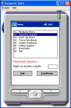 Ao selecionar a opção 02-Importar Arquivo, o programa estará copiando e carregando os arquivos da pesquisa, presentes na área especificada no RMSMobileB.exe.config. EAN.TXT e PesqPrc.txt. |