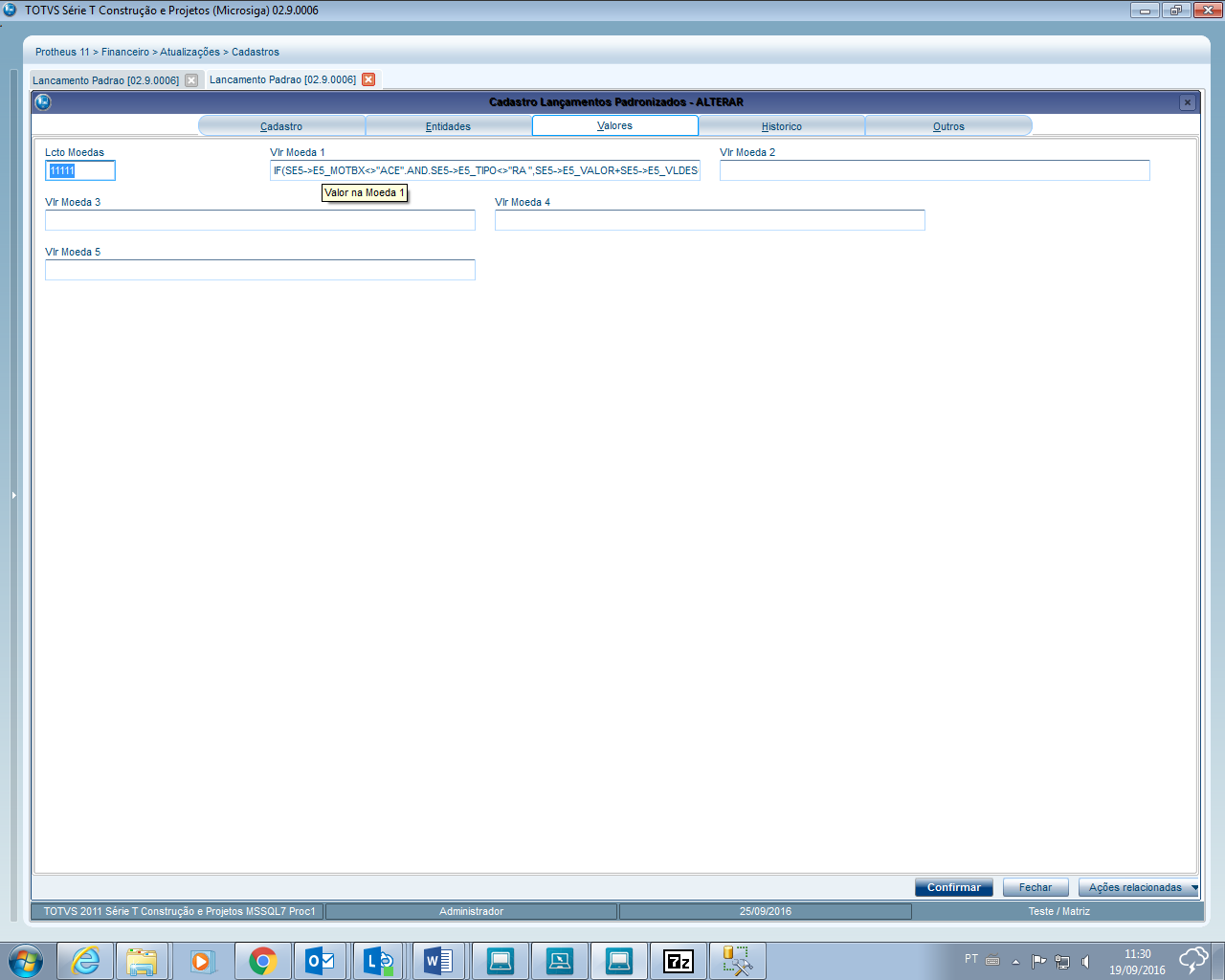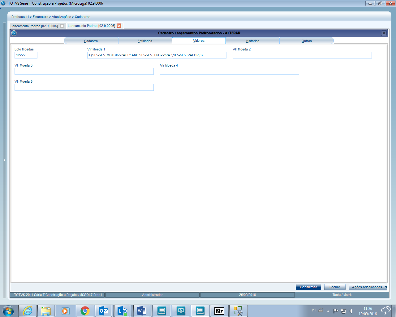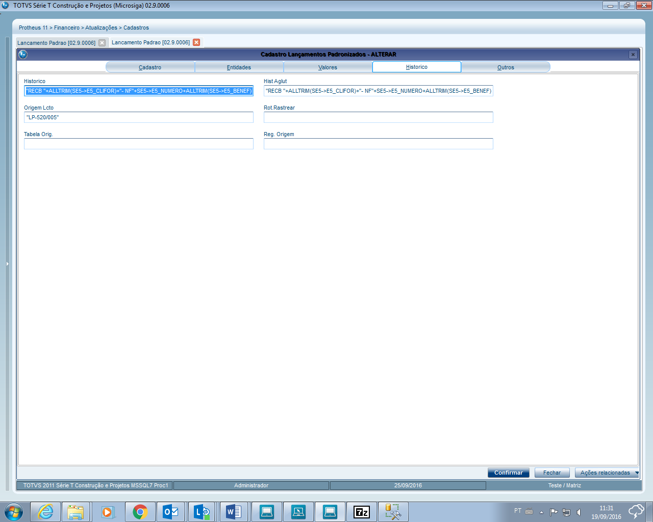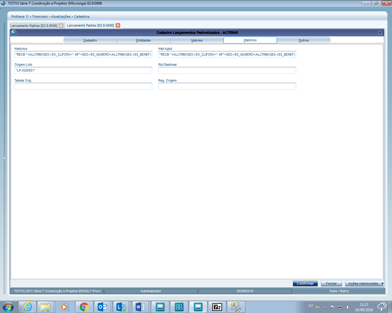 Passo a passo: | Para a geração dos lançamentos contábeis, das baixas dos títulos de contas a receber ou pagar os dados devem ser selecionados da tabela de movimentações bancárias SE5 Na Tabela SE5 é armazenados os dados referente a baixa, juros,multas,descontos, bem como os dados de código e nome do fornecedor e cliente, os lançamentos padrões podem ser definidos, como partida Simples gerando um lançamento a Débito e outro a Crédito, ou várias sequencias de lançamentos, atualizando o campo E5_LA do registro que foi criado o lançamento Contábil. Segue abaixo exemplo de configuração do lançamento padrão de baixa de Titulo a Receber com duas Sequencias Código 520: Sequência 001 - Débito Sequência 002 - Crédito