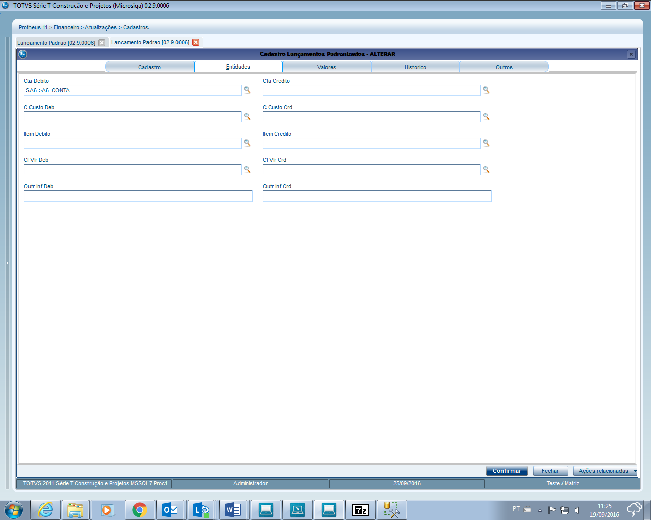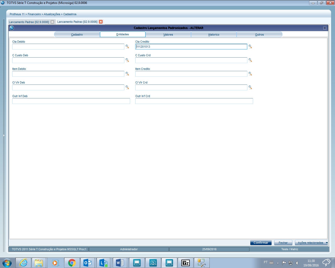 518 - Lançamento padrão utilizado na baixa de Contas a Pagar por Vendor - Contabilização On-line 519 - Lançamento padrão utilizado no Cancelamento da baixa de Contas a Pagar por Vendor - Contabilização On-line 530 - Lançamento padrão utilizado na baixa Manual ou Automática de Contas a Pagar - Contabilização On-line / Off-line 531 - Lançamento padrão utilizado no Cancelamento da baixa Manual ou Automática de Contas a Pagar - Contabilização On-line / Off-line