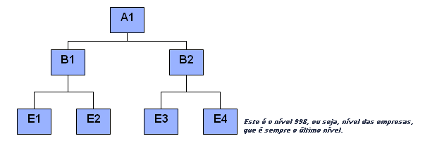 Descer Níveis | Inserir em quantos níveis na estrutura organizacional o programa deverá descer, partindo da Unidade Organizacional informada (que representa o nível 0 (zero)), para buscar os saldos corretos. Deve ser um valor entre 1 e 999. O default é 1. Os saldos das Unidades Organizacionais intermediárias também serão recalculados. Porém, as unidades organizacionais do nível 998 (empresa), não são recalculadas por este programa (apenas são recalculados pela recomposição de saldos (FGL)). Exemplo: Exemplo 1: São recalculados os saldos da unidade A1 parametrizada, e também os saldos de B1 e B2.