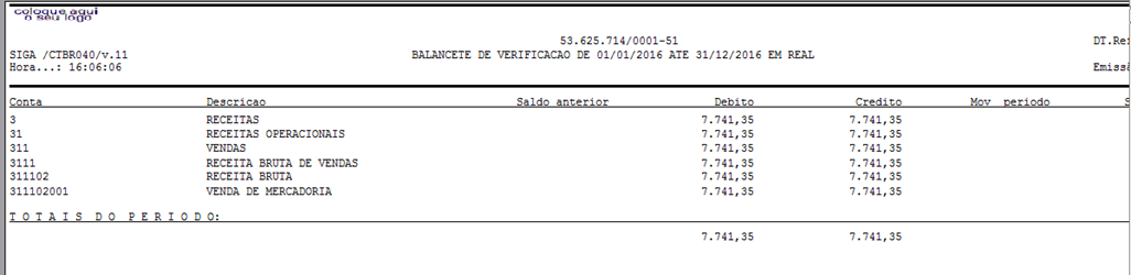 Veja que ao emitir somente a conta Analítica 311102001 o sistema gera o saldo da conta 7.741,35