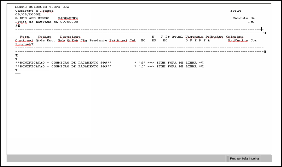 Este relatório é idêntico ao de Validação de Preços . Para parametrizar o processo, deve-se cadastrar, no programa de manutenção de transações (PITUTRAN), o usuário "PGRRFECH" programa "PABUADMP" (Atualização do Recebimento) e, no campo de transação 2 "N".