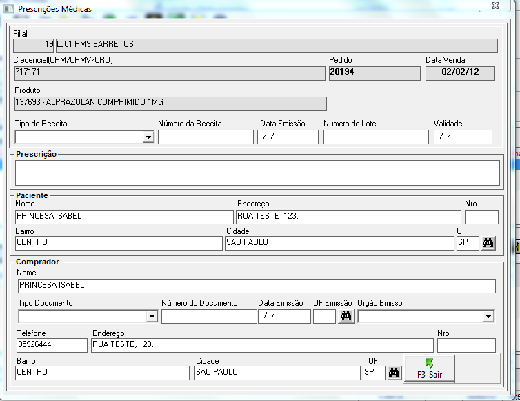 Note que é obrigatório digitar nome, CPF, endereço, RG tanto do Paciente como da pessoa que está comprando que pode ser diferente do paciente.