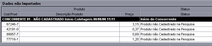 - Na parte inferior da tela são disponibilizados os códigos dos produtos por concorrente, que não foram importados.