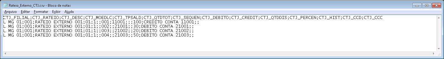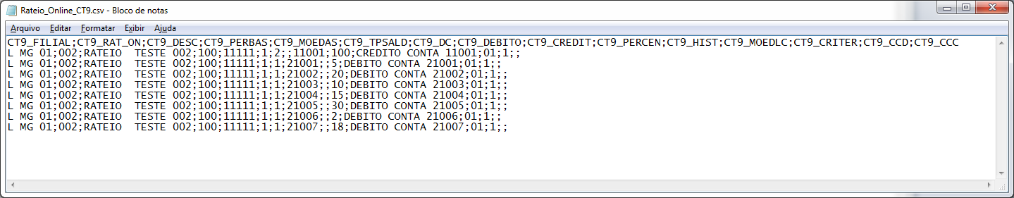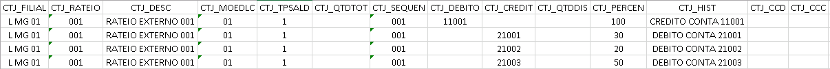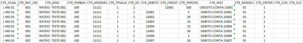 A primeira linha do arquivo possuirá os campos da tabela do rateio (CT9 – Rateio Online, CTJ – Rateio Offline ou CTQ – Rateio Externo), sem necessidade de ordem especifica. As demais linhas serão os dados dos rateios, sendo informados de acordo com o cabeçalho.