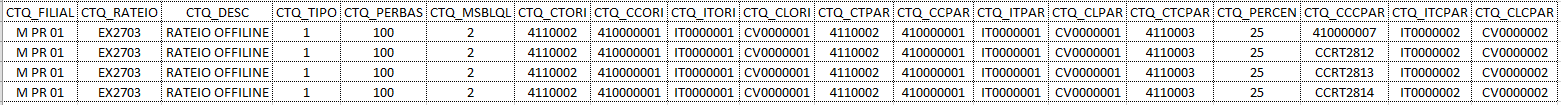CTQ_FILIAL;CTQ_RATEIO;CTQ_DESC;CTQ_TIPO;CTQ_PERBAS;CTQ_MSBLQL;CTQ_CTORI;CTQ_CCORI;CTQ_ITORI;CTQ_CLORI;CTQ_CTPAR;CTQ_CCPAR;CTQ_ITPAR;CTQ_CLPAR;CTQ_CTCPAR;CTQ_PERCEN;CTQ_CCCPAR;CTQ_ITCPAR;CTQ_CLCPAR M PR 01;EX2703;RATEIO OFFILINE;1;100;2;4110002;410000001;IT0000001;CV0000001;4110002;410000001;IT0000001;CV0000001;4110003;25;410000007;IT0000002;CV0000002 M PR 01;EX2703;RATEIO OFFILINE;1;100;2;4110002;410000001;IT0000001;CV0000001;4110002;410000001;IT0000001;CV0000001;4110003;25;CCRT2812;IT0000002;CV0000002 M PR 01;EX2703;RATEIO OFFILINE;1;100;2;4110002;410000001;IT0000001;CV0000001;4110002;410000001;IT0000001;CV0000001;4110003;25;CCRT2813;IT0000002;CV0000002 M PR 01;EX2703;RATEIO OFFILINE;1;100;2;4110002;410000001;IT0000001;CV0000001;4110002;410000001;IT0000001;CV0000001;4110003;25;CCRT2814;IT0000002;CV0000002
