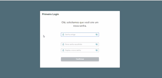 Quando o usuário efetuar o primeiro login será aberto uma tela solicitando a senha antiga, nova senha e a confirmação da nova senha.