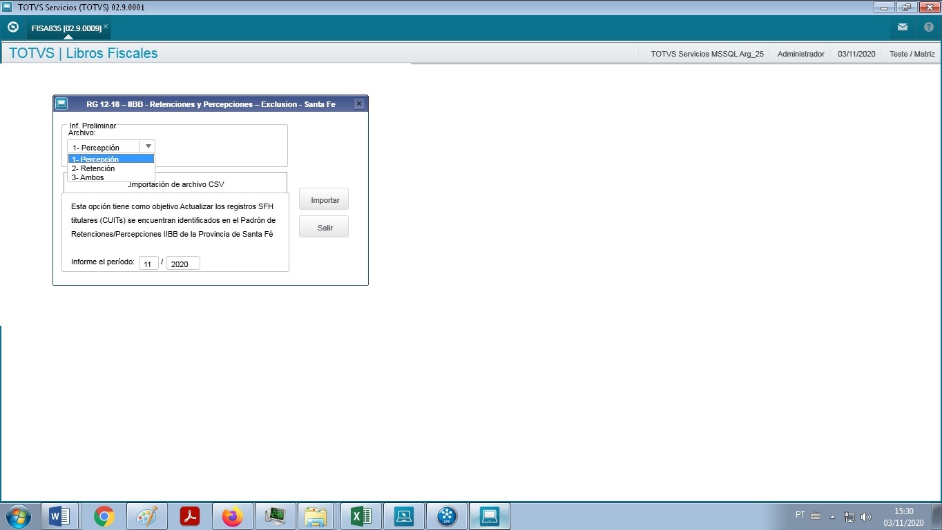 - Acceda a la rutina, informando el tipo de impuesto (Percepción/Retención/Ambos) y el período (Mes/Año).