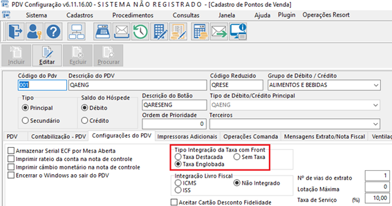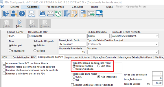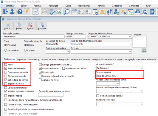 - Cadastro do Tipo Débito/Crédito Taxa de Serviço