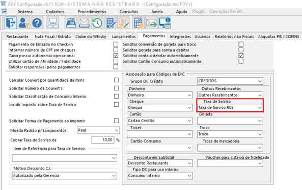 Acessar o menu Sistema - Configuração - Parâmetros do Sistema e na aba Tipo Débito/Crédito apontar o débito/crédito da taxa de serviço.