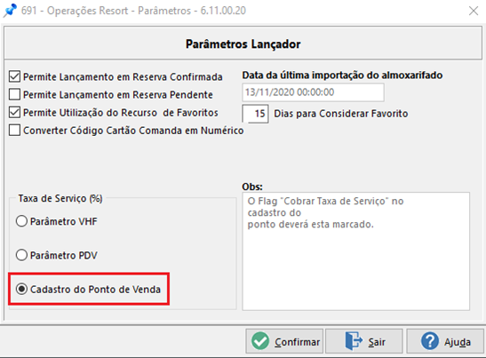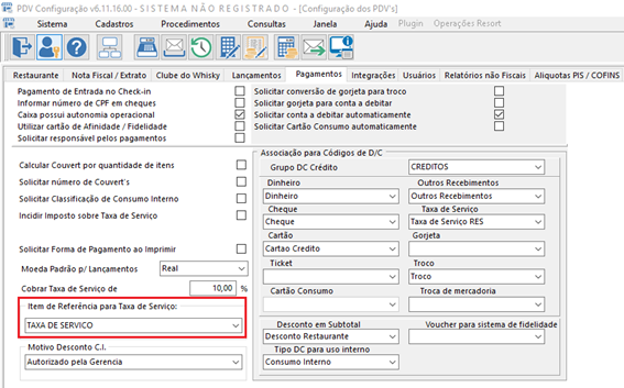 Para esta parametrização é necessário possuir um item TAXA DE SERVIÇO cadastrado e devidamente associado ao cadastro de Ponto de Venda.