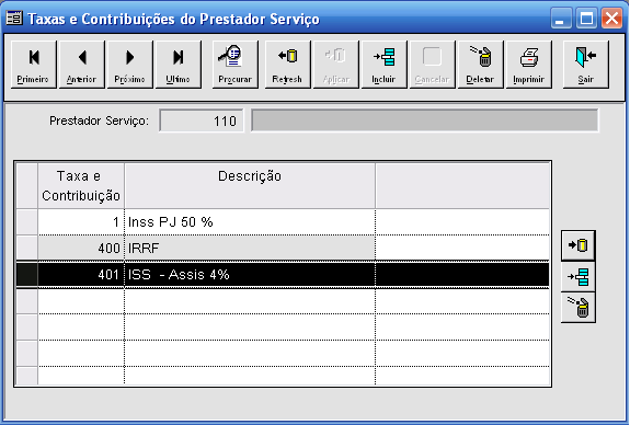 2) Prestar manutenção no cadastro de taxas dos prestadores de serviços em PGCBSERV, menu Tabelas \ Taxas \ Taxas do Prestador de Serviços.