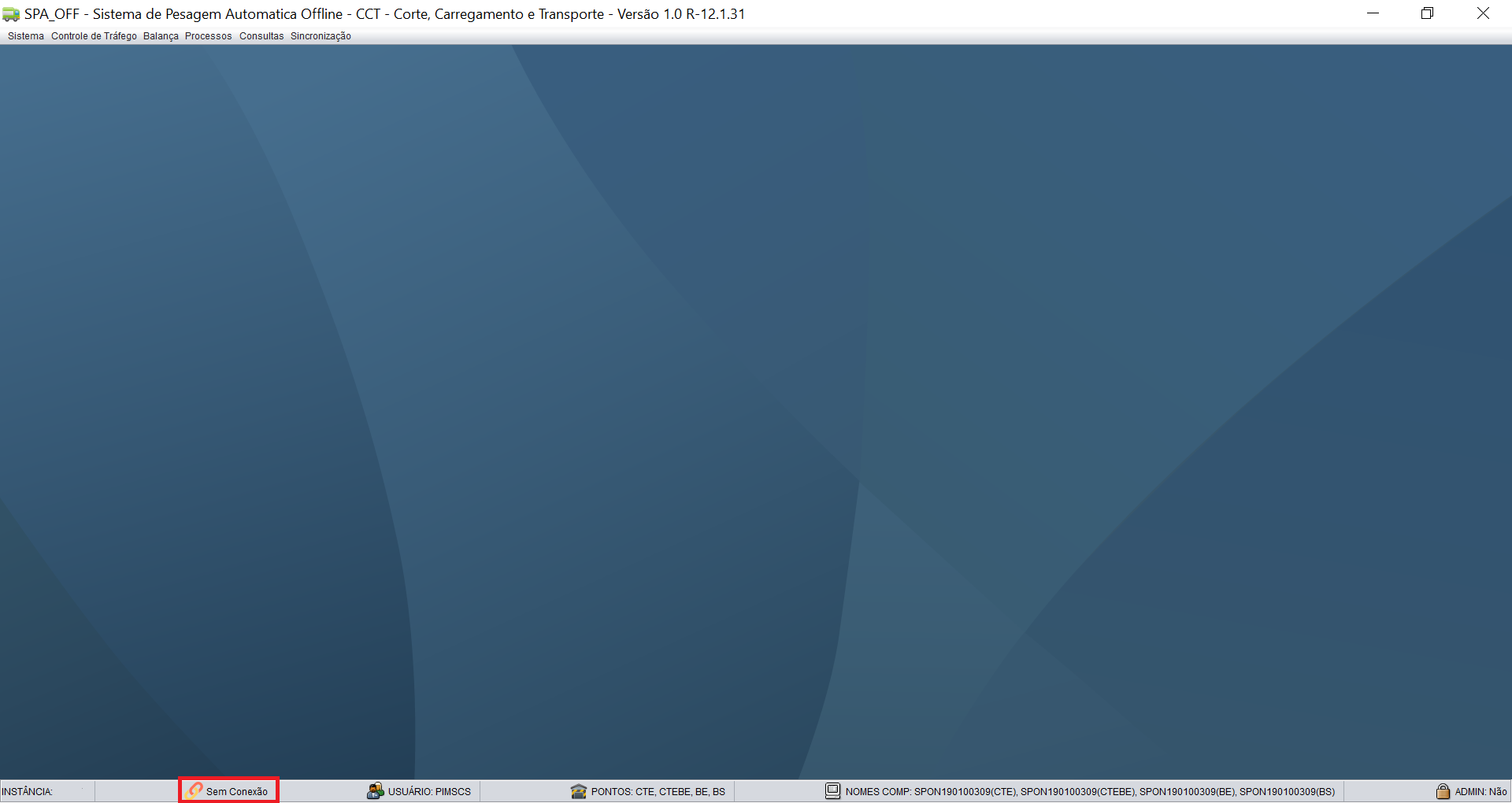 Esse documento visa apresentar o processo de pesagem em contingência, que ocorre quando o servidor está fora do ar. É possível verificar se a aplicação está operando em modo de contingência, verificando o status da conexão, na barra inferior, como demonstra a imagem abaixo: