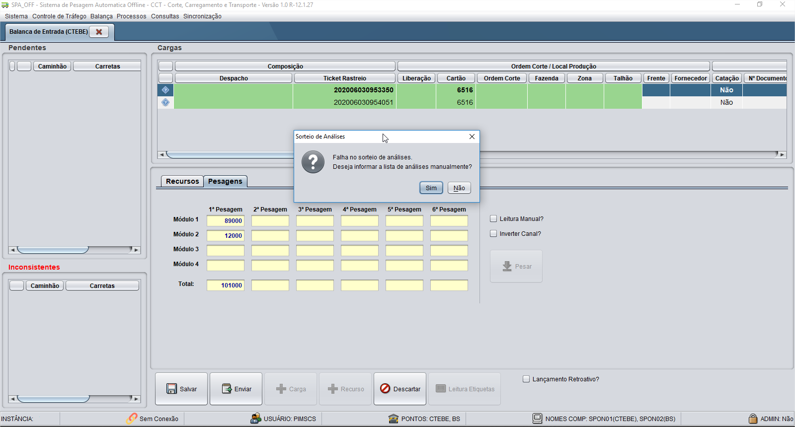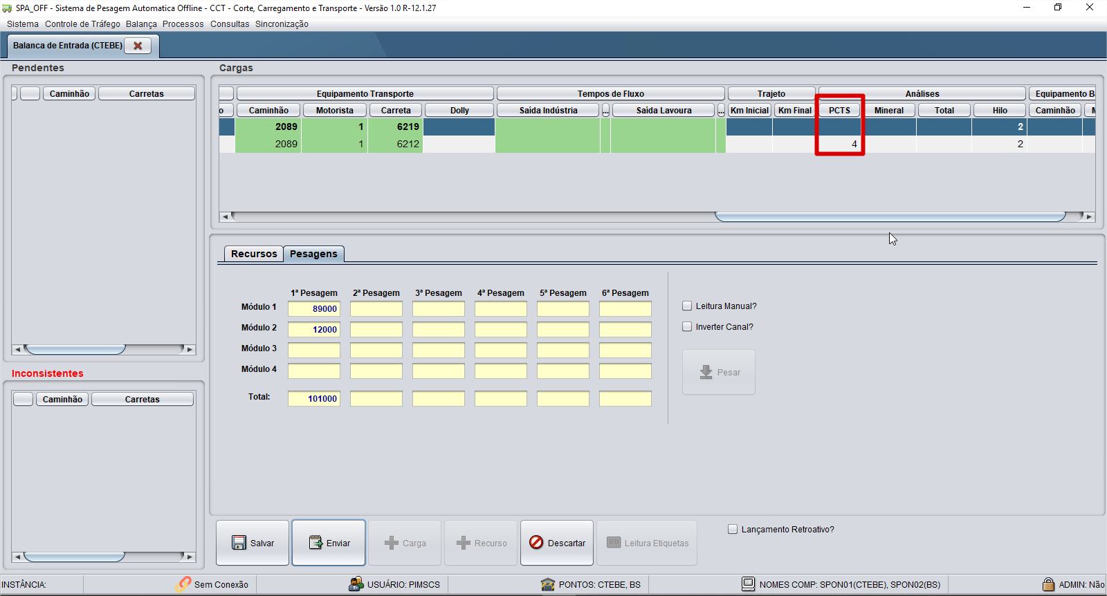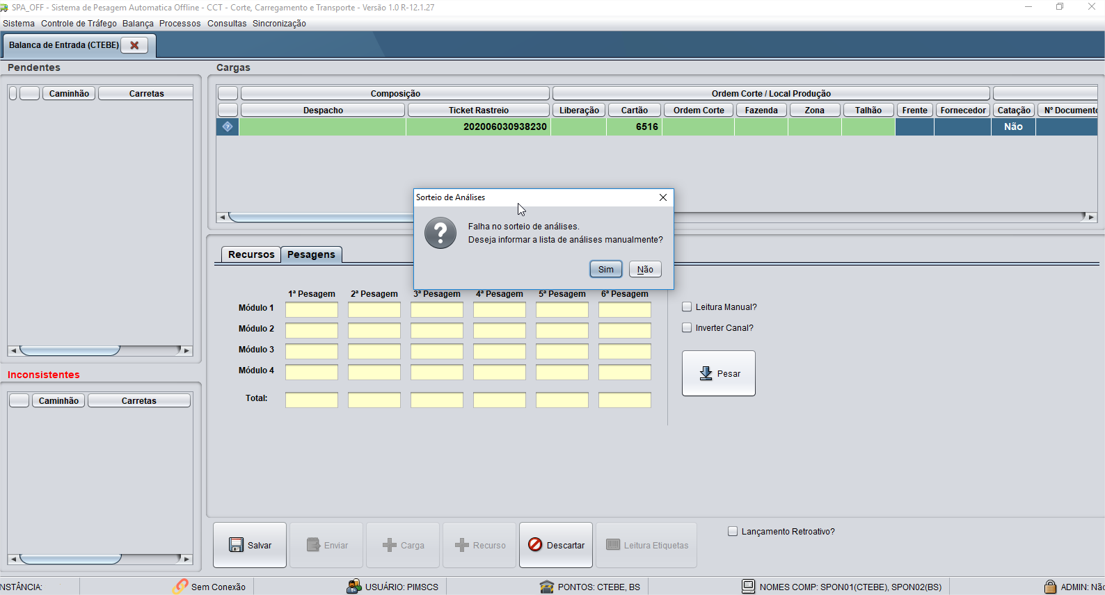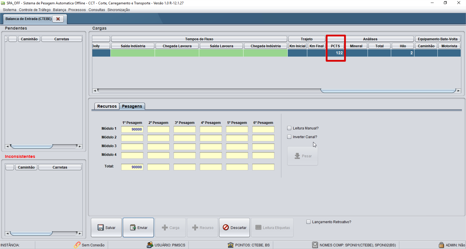 Com o sistema operando em modo contingência, basta realizar a pesagem normalmente. Muito IMPORTANTE, quando realizar a pesagem, para que o processo de envio automático das cargas ocorra, SEMPRE que for finalizar clicar no botão ENVIAR. O botão de Salvar é para ser utilizado apenas quando o intuito é salvar a carga para finalizar depois.