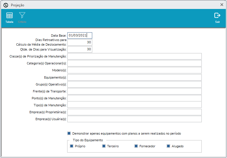 Objetivo: Realizar uma projeção das manutenções preventivas a longo prazo, bem como os materiais necessários para sua realização. A geração da projeção pode ser realizada utilizando algum dos filtros demonstrados abaixo ou sem utilização de nenhum filtro. Lembrando que os 3 primeiros campos que aparecem no sistema, são automaticamente preenchidos e obrigatórios, porém editáveis conforme necessidade.