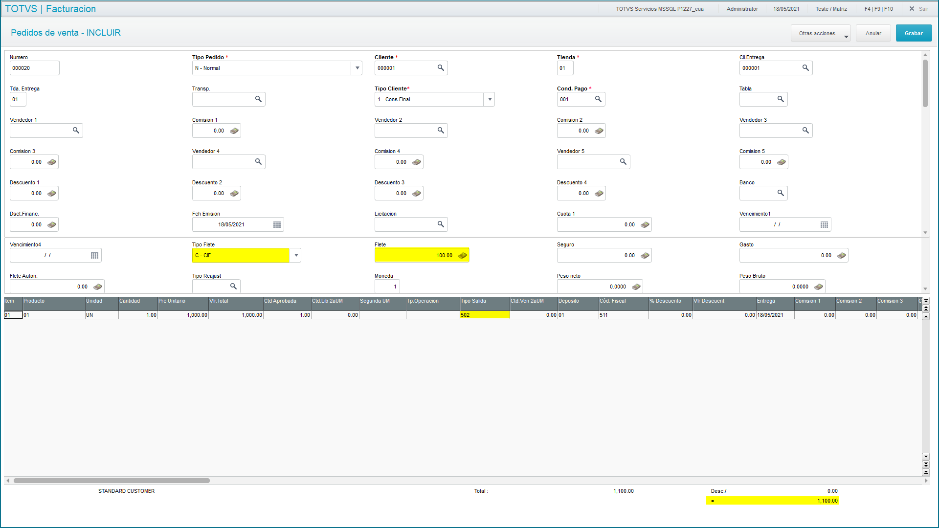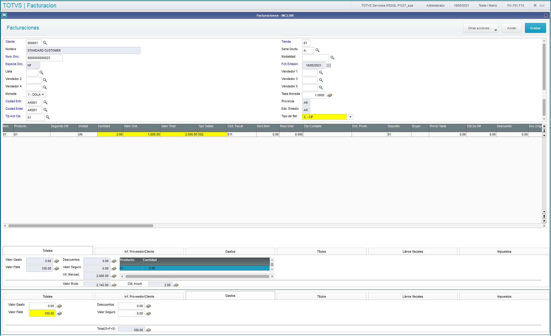 - En el encabezado, informar un valor de Flete, y un Tipo de Flete igual a C - CIF