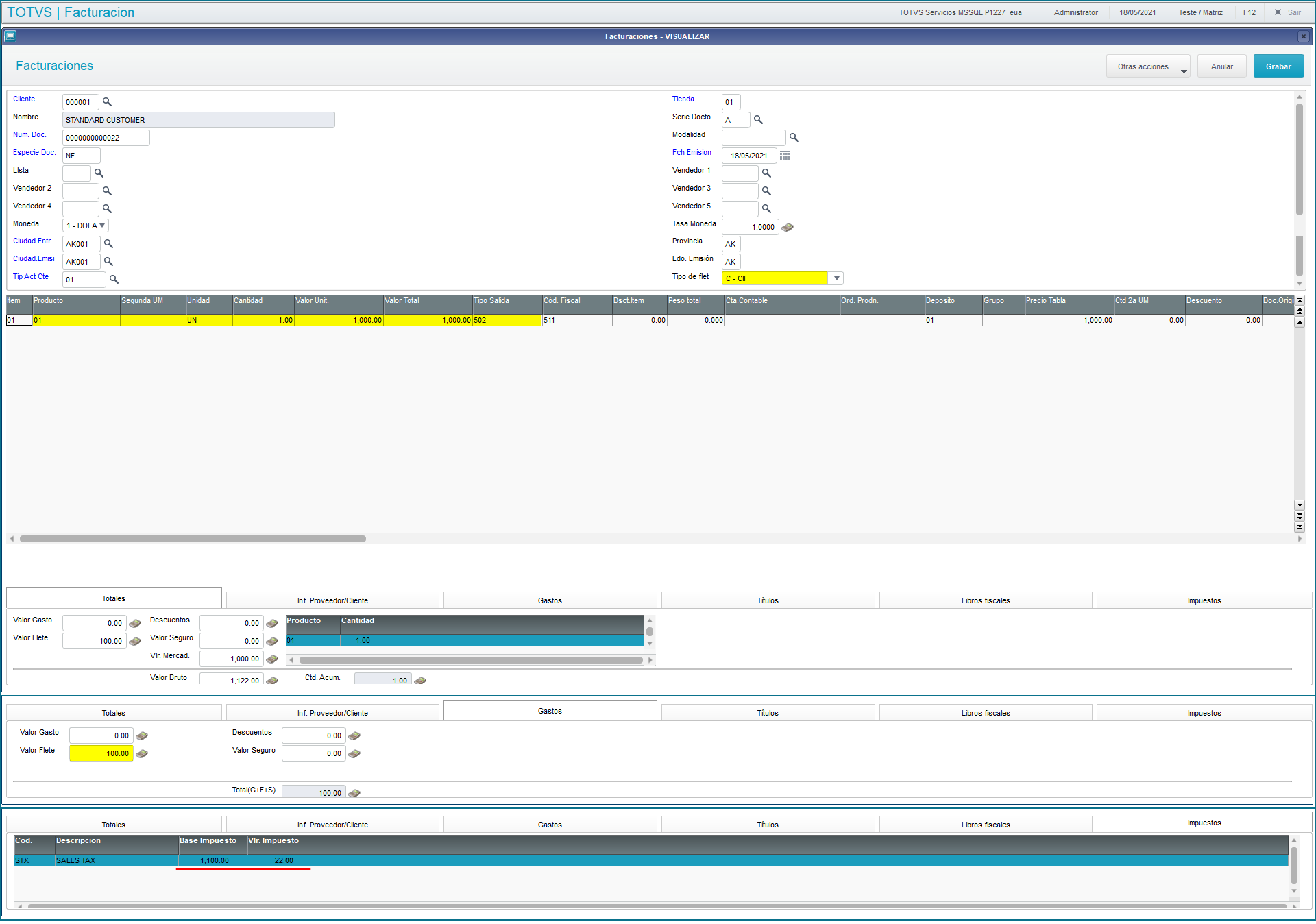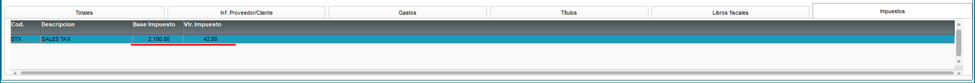 - En el detalle de los ítems, informar la TES con cálculo del impuesto Sales Taxes.