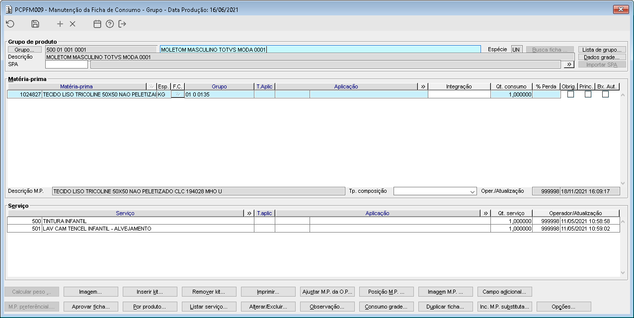 Imagem 2 - Demonstra a ficha de consumo com uma matéria-prima cadastrada onde a quantidade de consumo é 1.