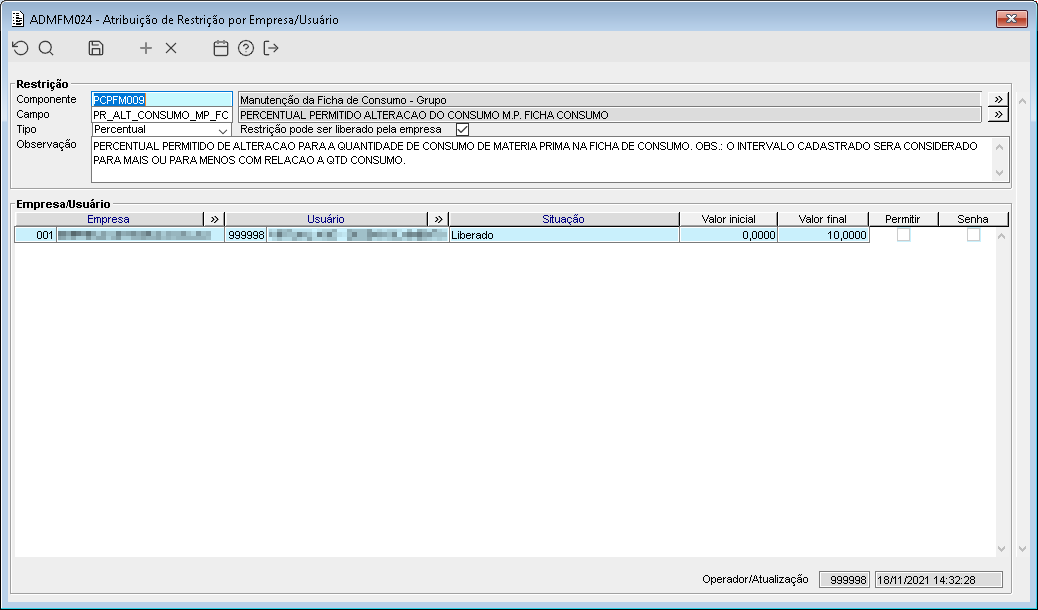 Foi criada a restrição PR_ALT_CONSUMO_MP_FC vinculada ao componente PCPFM009. Será possível informar o percentual inicial e final que irá ser utilizado como base para validar se permite ou não a alteração da quantidade de consumo.