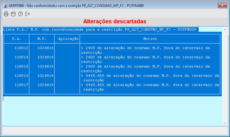 Observação: A validação pelo componente PCPFM021 ocorre ao clicar no botão confirmar e a mensagem de aviso é apresentada pelo componente GERFP008 com uma lista, contendo o produto, matéria-prima e aplicação que não foi possível realizar a alteração, conforme demonstrado na imagem 4.