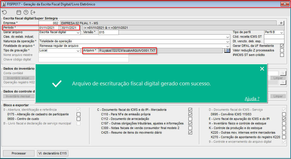 Imagem 34 - Demonstração do componente FISFP017, com a geração do arquivo EFD (ARQUIVO3.TXT), do período de 01/11/2021 a 31/11/2021, anterior a do parâmetro DT_INI_VIGENCIA_TRIBOUT, que é 01/12/2021, portanto, com o ICMS destacado normalmente.