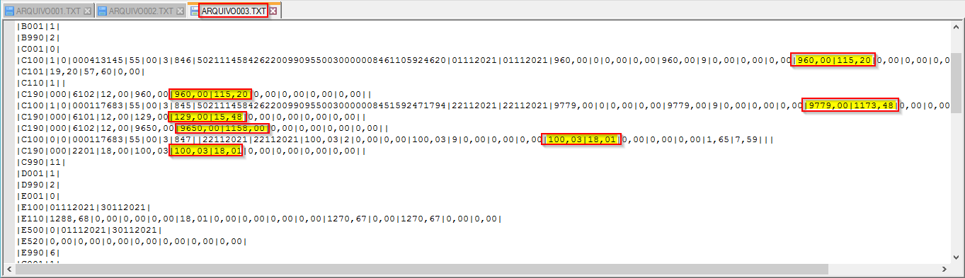 Imagem 35 - Demonstração conteúdo do arquivo EFD (ARQUIVO3.TXT), do período de 01/11/2021 a 31/11/2021, gerado pelo componente FISFP017. Observe que o valor da base de cálculo do ICMS e o valor do ICMS foram destacados normalmente, porque o período do arquivo gerado é anterior ao informado no parâmetro DT_INI_VIGENCIA_TRIBOUT, que é 01/12/2021.