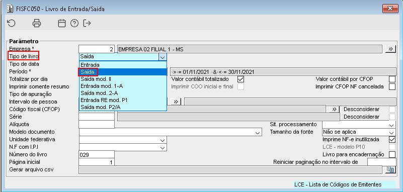 Imagem 02 - Demonstração do filtro no componente FISFC050 do tipo Saída.