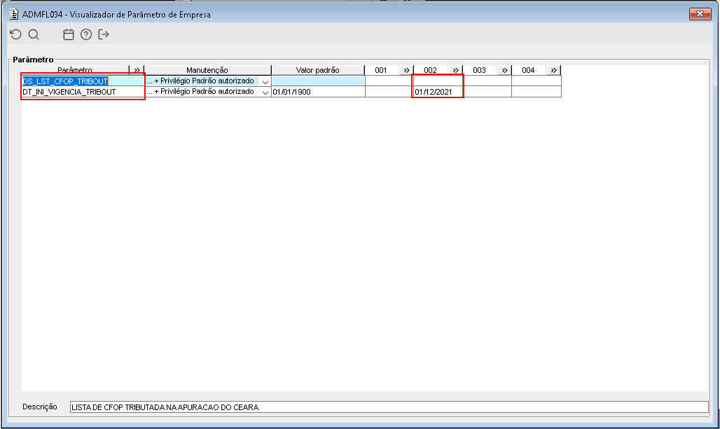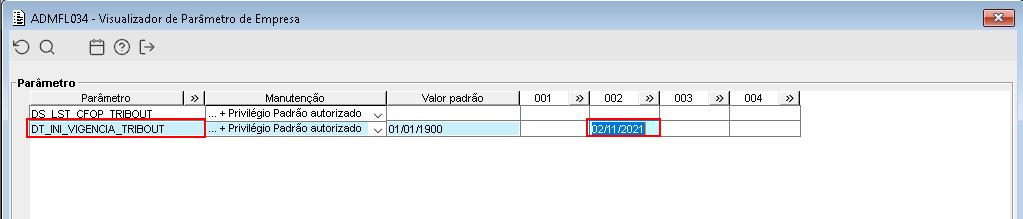 Imagem 33 - Demonstração do parâmetro DT_INI_VIGENCIA_TRIBOUT configurado com 01/12/2021, para gerar a partir desta data, o arquivo EFD com o valor base de cálculo do ICMS e o valor do ICMS, zerados para todos os CFOPs (parâmetro DS_LST_CFOPTRIOUT não configurando com CFOP).