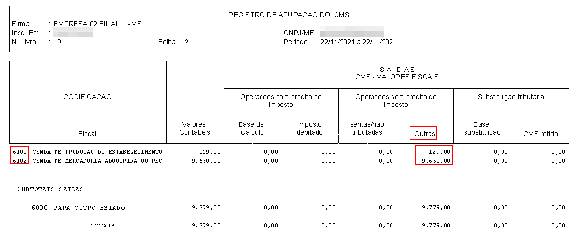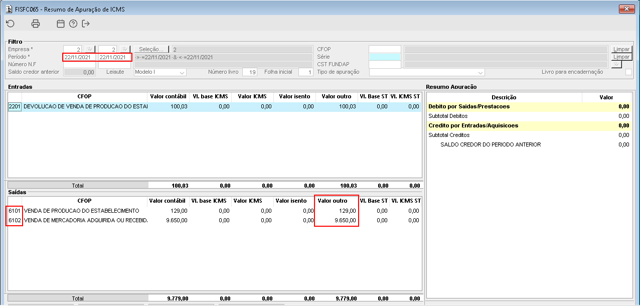 Imagem 18 - Demonstração do livro de apuração do ICMS com os CFOPs 6101 e 6102 informando a base de cálculo do ICMS em campo Outros, na data de 22/11/2021 devido a configuração do parâmetro DT_INI_VIGENCIA_TRIBOUT ser 01/11/2021.