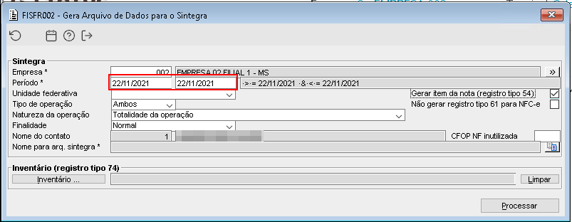 Imagem 20 - Filtro utilizado na geração do arquivo com a data de 22/11/2021.