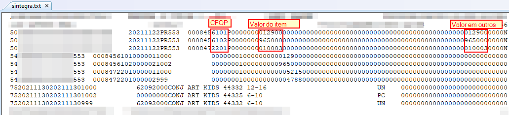 Imagem 21 - Arquivo Sintegra gerado destacando o ICMS em campo próprio, na data de 22/11/2021 devido a configuração do parâmetro DT_INI_VIGENCIA_TRIBOUT ser 01/12/2021.