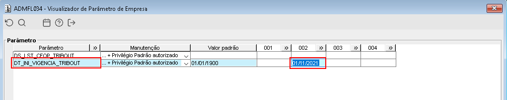 Imagem 01 - Configuração do parâmetro DT_INI_VIGENCIA_TRIBOUT para o sistema informar o valor da base de cálculo do ICMS no campo Outros, de todos os CFOPs apenas a partir de 01/11/2021.