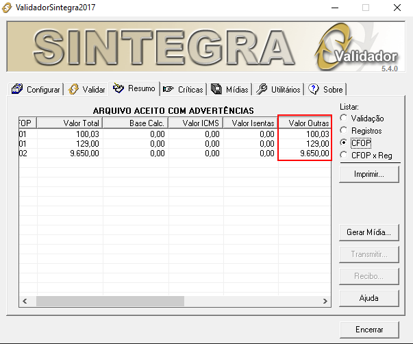 Imagem 22 - Demonstração dos valores no validador do arquivo Sintegra.