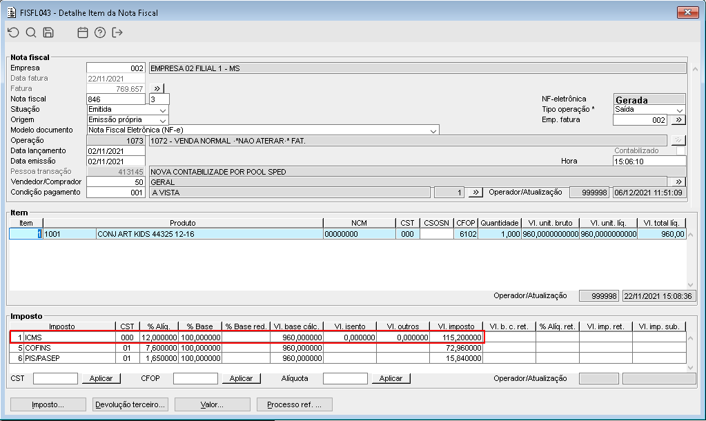 Imagem 15 - Demonstração do relatório do componente destacando o ICMS em campo próprio, na data de 22/11/2021 devido a configuração do parâmetro DT_INI_VIGENCIA_TRIBOUT ser 01/12/2021.
