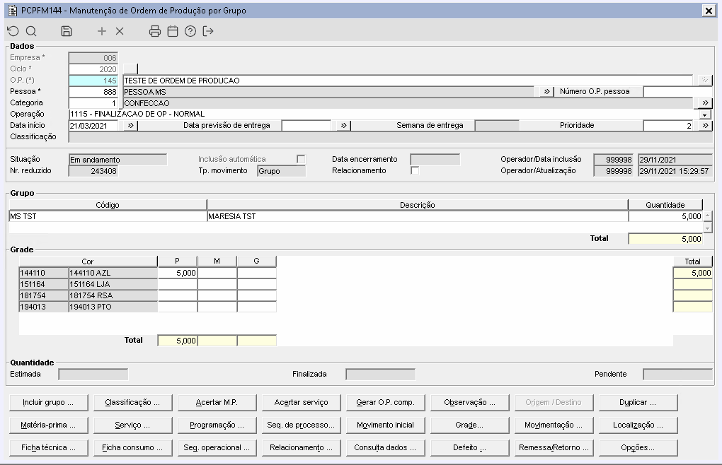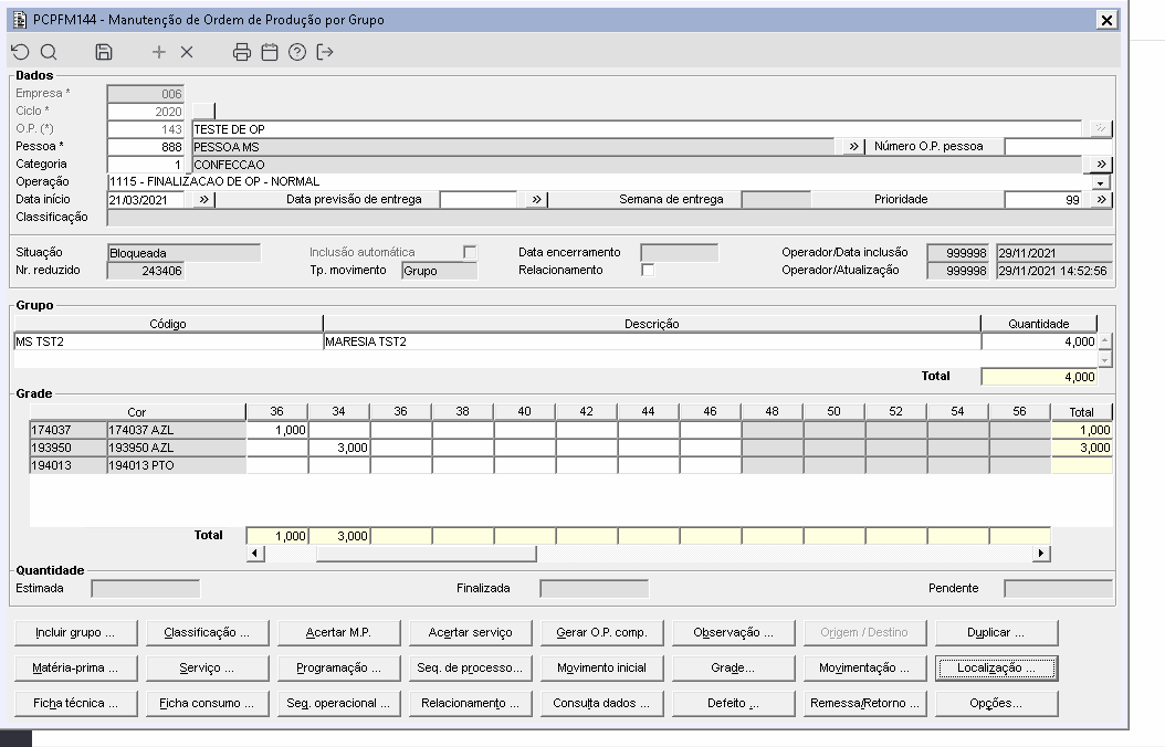 | Função: | PCPFM144 - Manutenção de Ordem de Produção por Grupo |