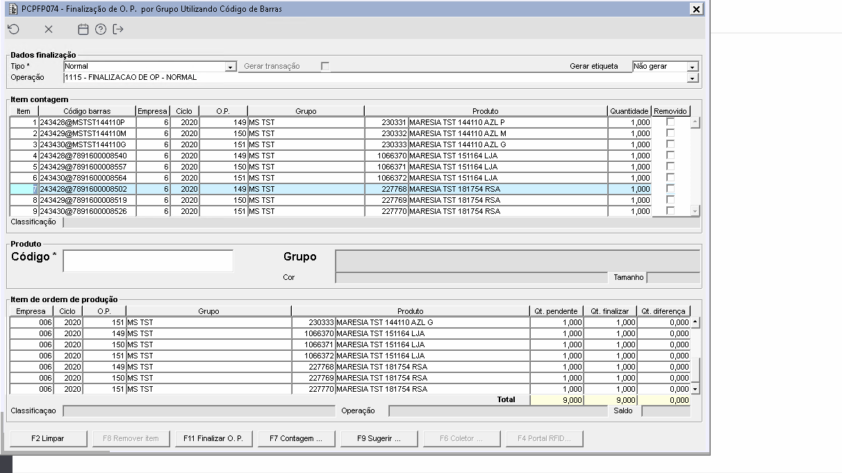 | Função: | PCPFP074 - Finalização de O.P. por Grupo Utilizando Código de Barras |