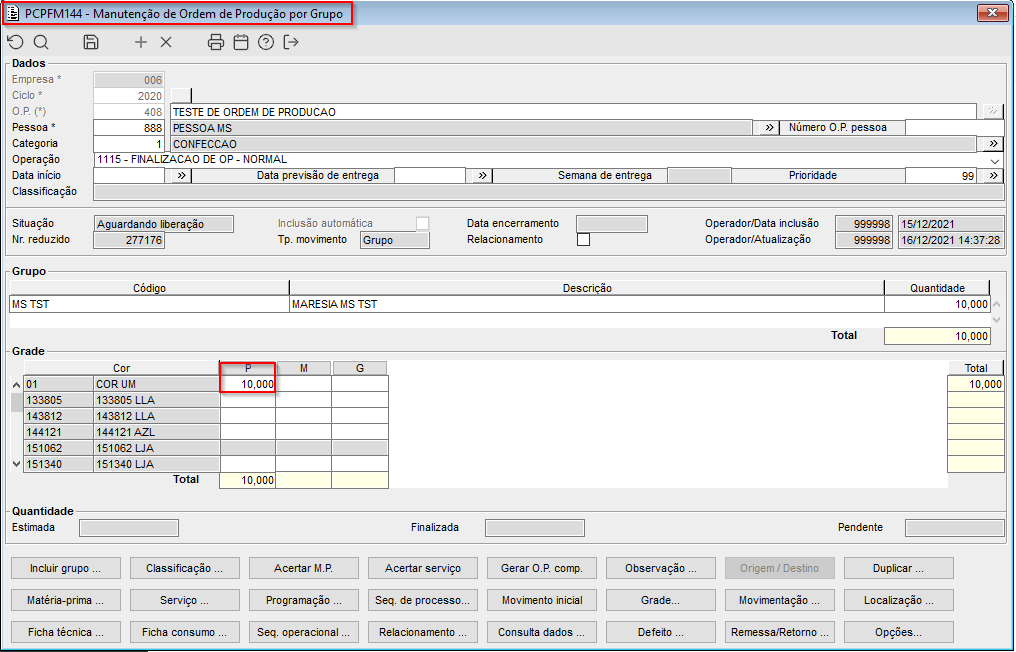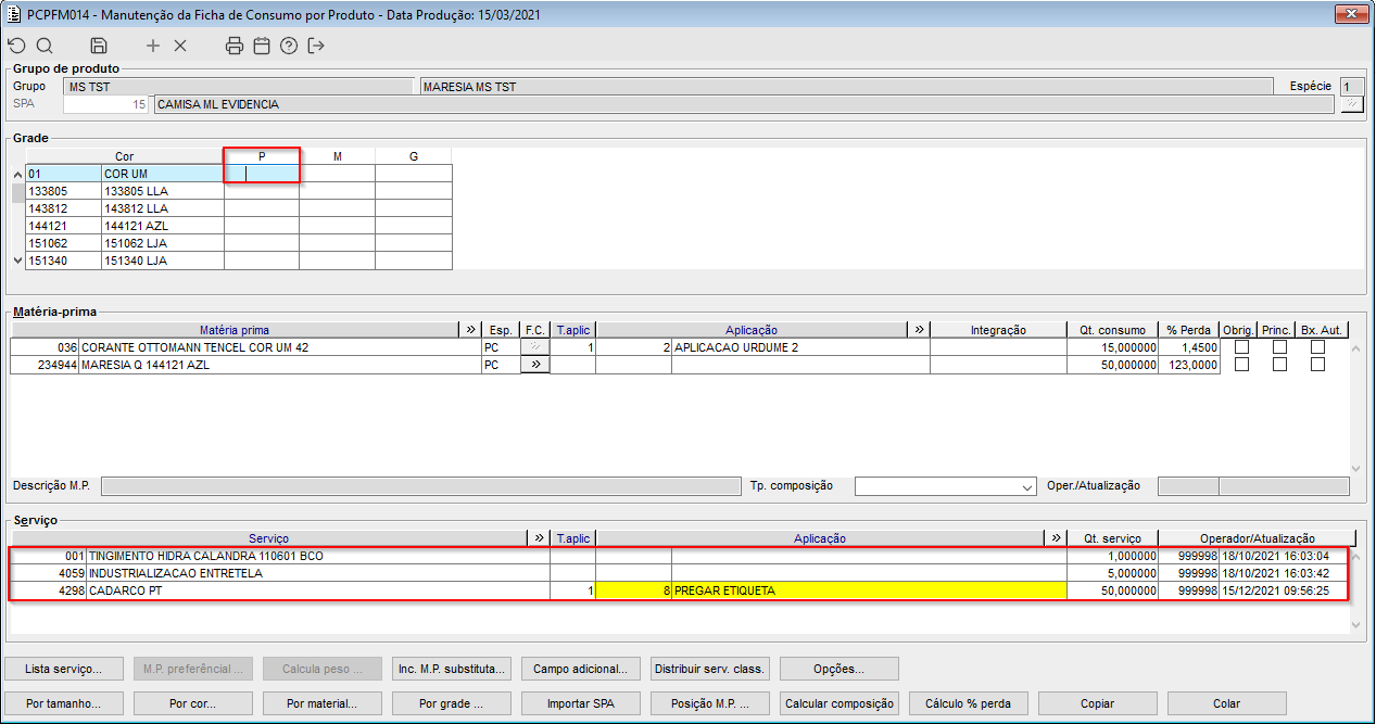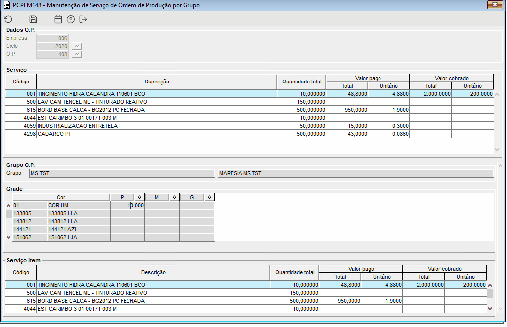 Imagem 8 - Na imagem acima incluímos um novo item a O.P. no tamanho M com 30 de quantidade e incluímos o novo serviço por grupo diretamente a ordem de produção.