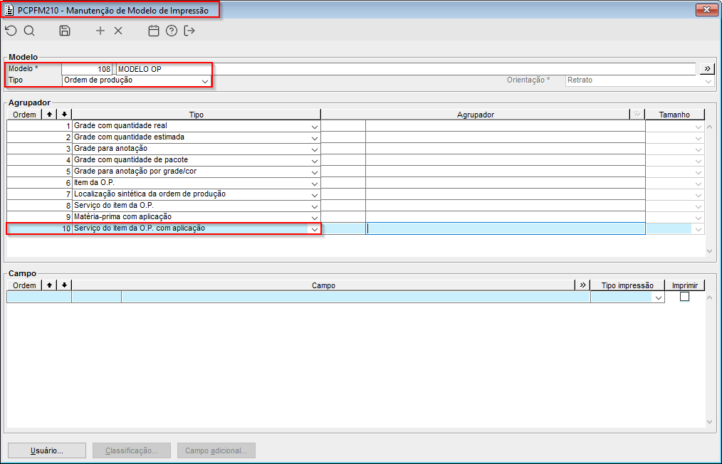 No componente PCPFM210 disponibilizar novo item para impressão de serviço da O.P. com suas respectivas aplicações. Quando houverem serviços vinculados a matéria-prima ou diretamente a ordem de produção estes dados devem ser impressos através do relatório configurável.