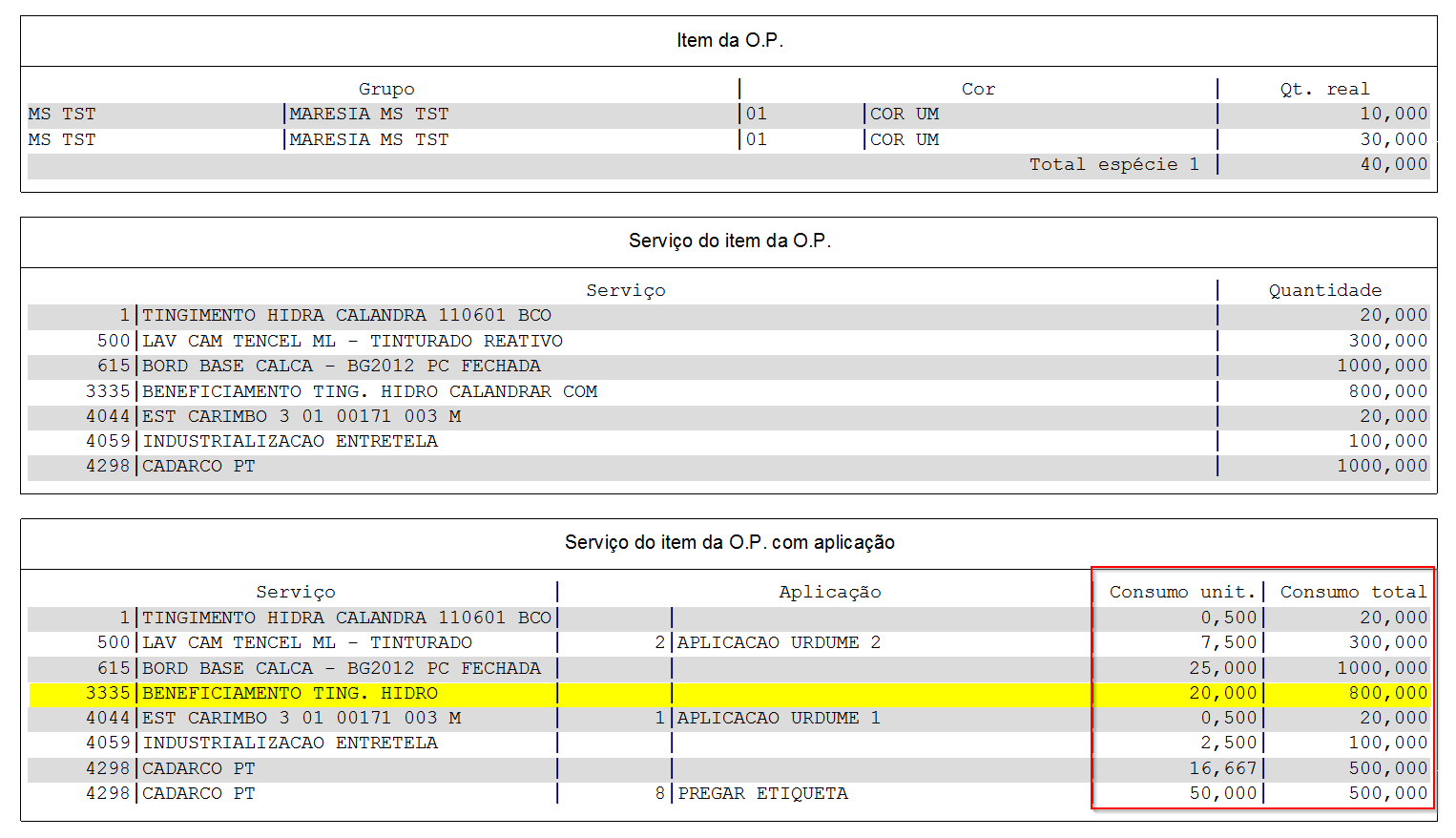 Imagem 5 - Na imagem acima o relatório foi emitido corretamente. Trazendo os serviços, aplicações e valores de consumo unitário calculados corretamente.