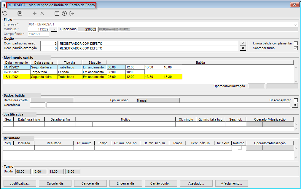 Imagem 4 - Na imagem acima, temos o cálculo do dia 15/11/2021, mantendo o tipo do dia como "Trabalhado", conforme a configuração do parâmetro.