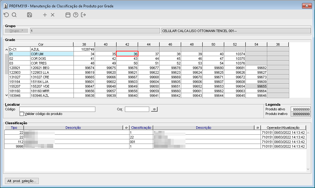 Imagem 3 - Para a matéria-prima 036 não foi configurada a classificação 511/4.