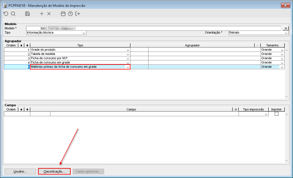 Imagem 4 - No componente PCPFM210 foi selecionado o modelo 500, o agrupador "Matérias-primas da ficha de consumo em grade" e acionado o botão "Classificação..."
