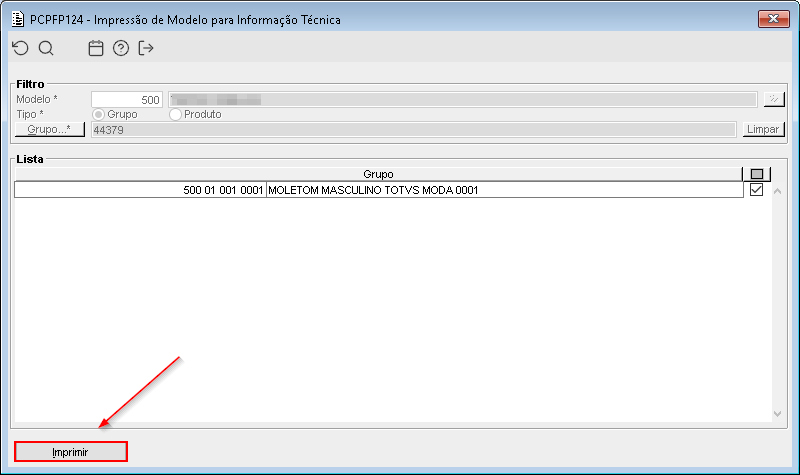 Imagem 6 - No componente PCPFP124 foi selecionado o modelo 500 e o grupo "500 01 001 0001". Depois foi acionado o botão "Imprimir".