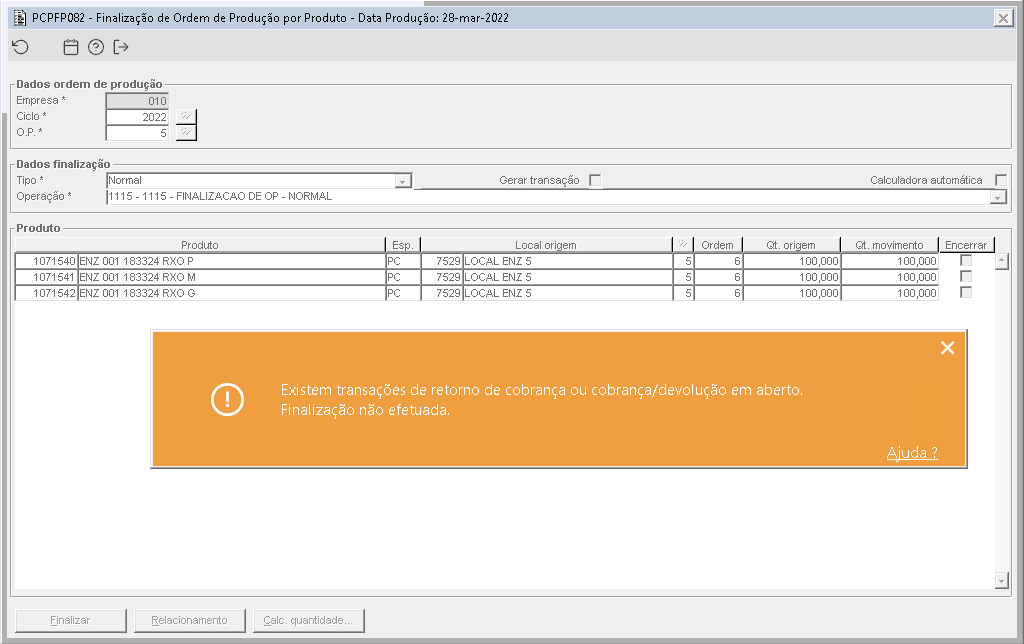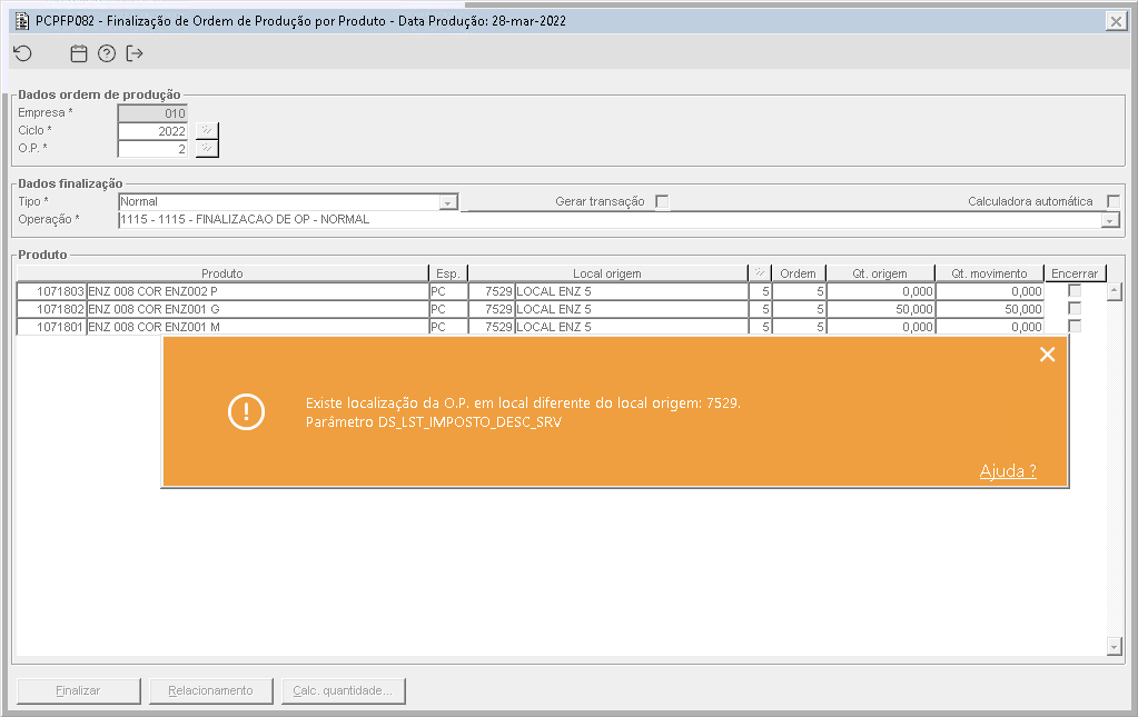 - Com o parâmetro configurado, ao tentar realizar uma finalização de O.P. com a localização diferente do local de origem do movimento de finalização, uma mensagem de aviso será exibida e a finalização será abortada.