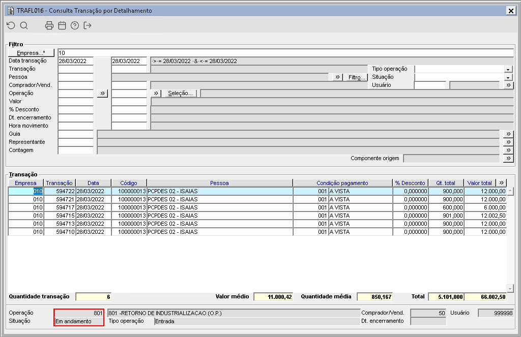 Imagem 5 - Situação da transação cobrança/devolução em andamento.
