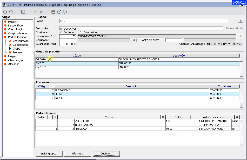 Ao acessar o componente CDFFM175, todos os grupos de produto com ocorrências serão carregados e conforme o foco no grupo será carregada as listas de processo e padrão técnico. Ao navegar através do botão "Duplicar", as informações similares ao critério anterior serão recarregadas em tela.