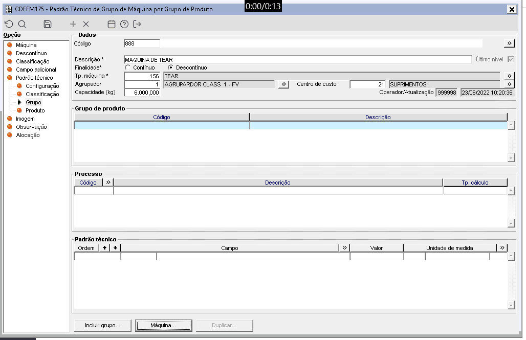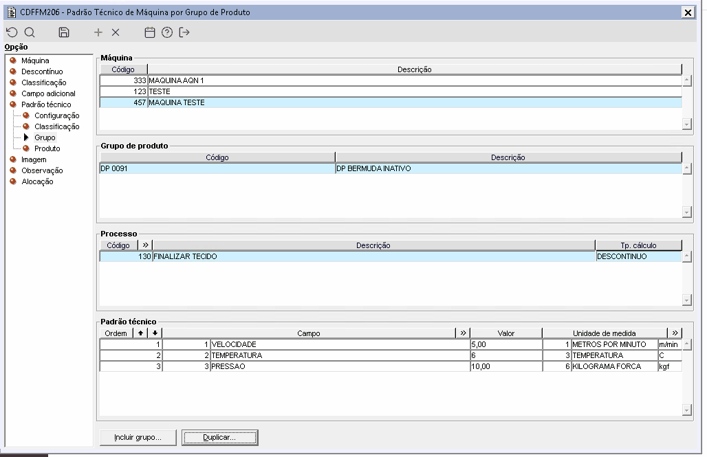 | Função: | CDFFM206 - Padrão Técnico de Máquina por Grupo de Produto |